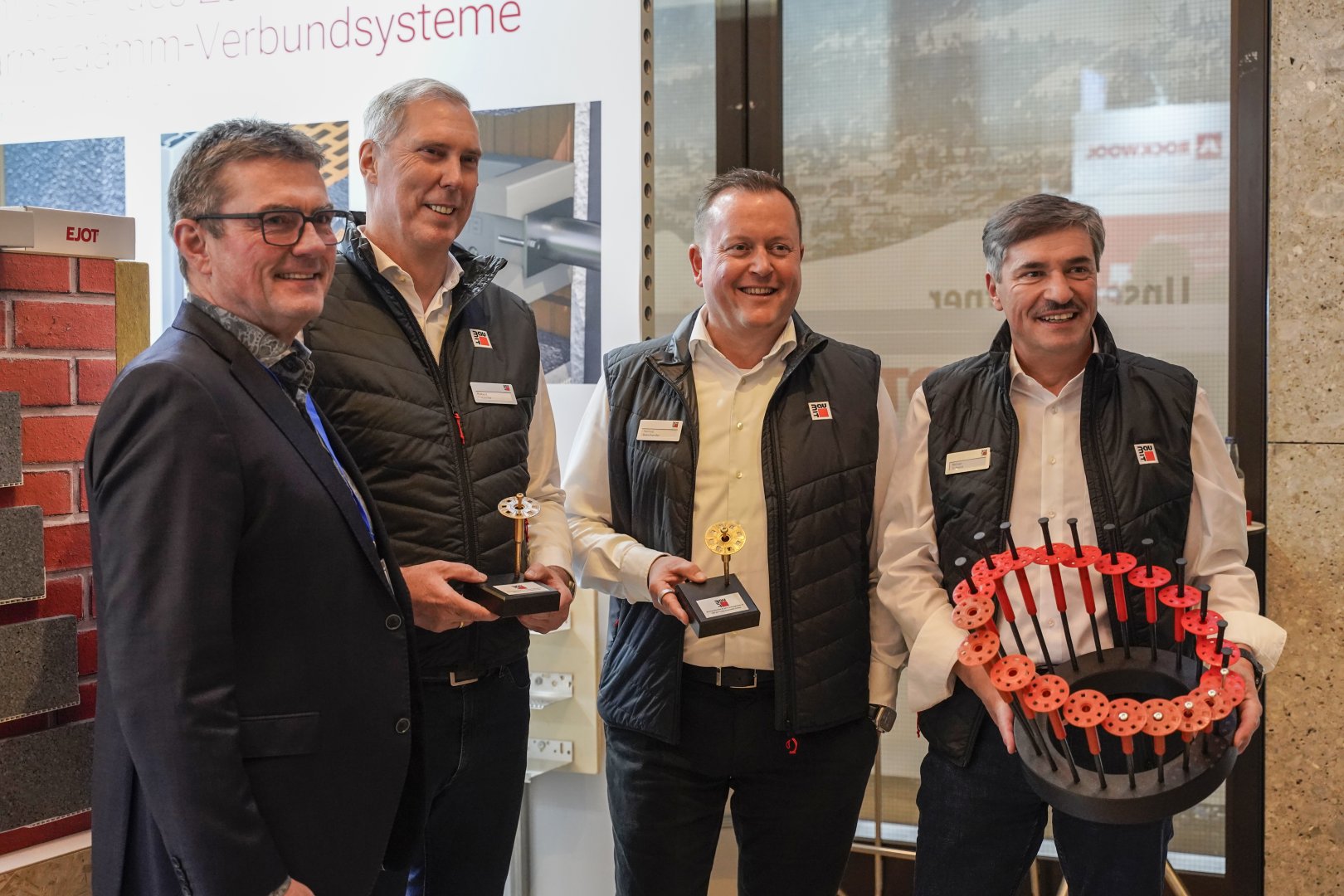 Im Bild von links nach rechts: Jens Schmidt (Leiter EJOT-Marketing und Vertrieb), Robert Fritzsche (Geschäftsführer Baumit), Helmut Batscheider (ehem. Geschäftsführer Baumit), Reiner Schmid (Geschäftsbereichsleiter Produkttechnik)